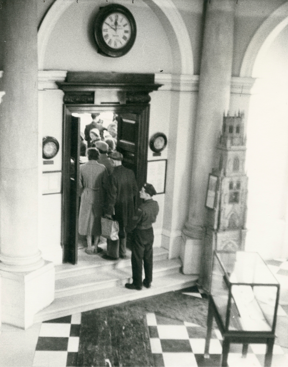 black and white photo. people queueing to enter tall doors in an arched doorway. Floor is black and white tiles and there is a glass display case.
