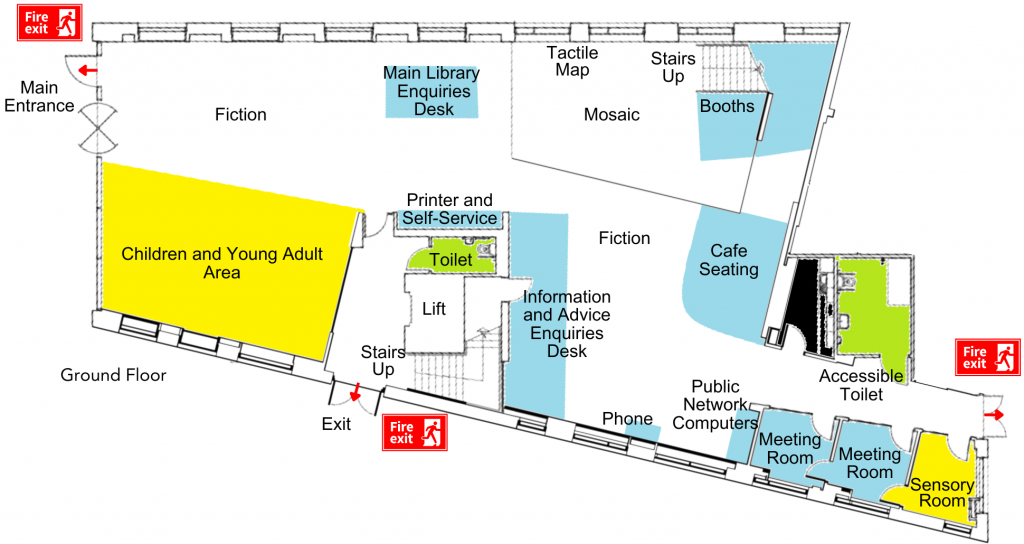 - A tactile map can be found by the main stairs on the ground floor and in the Community Space Foyer on the first floor.